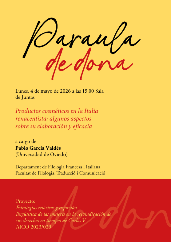 El próximo lunes 4 de mayo a las 15:00h el profesor Pablo García de la Universidad de Oviedo impartirá un seminario titulado Productos cosméticos en la Italia reacentista: algunos aspectos sobre su elaboración y eficacia. El seminario puede seguirse en la Sala de Juntas del Departamento de Filología Francesa e Italiana, Facultat de Filologia, Traducció i Comunicació de la Universitat de València u online en el siguiente enlace.